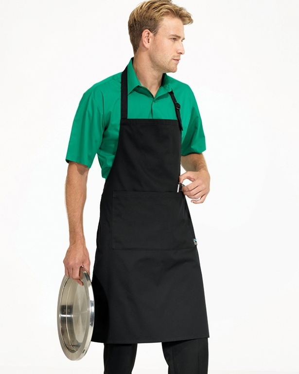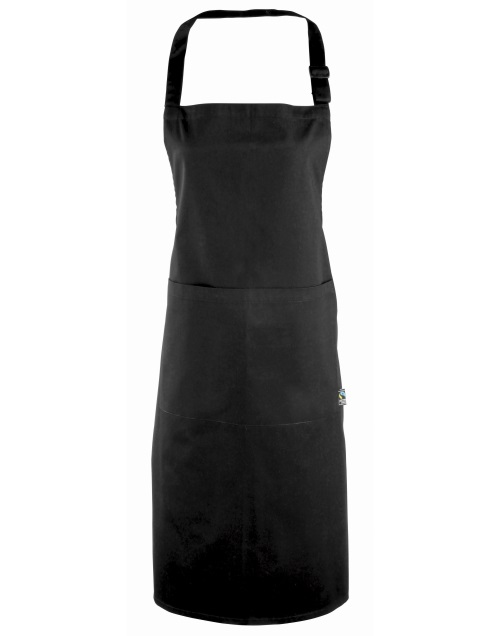 This hospitality work Fairtrade Cotton apron has a single pocket, same colour ties and neck tie with an adjustable buckle. The apron's cotton fabric is crease resistant and can be washed at 40°.