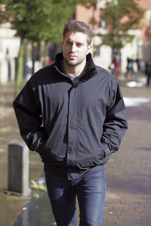 A comfort fit lightweight and waterproof stylish jacket, cosy warm fleece lined to the body with insulated polyester lining to the sleeves, foldaway hood, velcro adjustable cuffs, two side pockets, mobile phone inner pocket and a fitted comfort waistband hem.