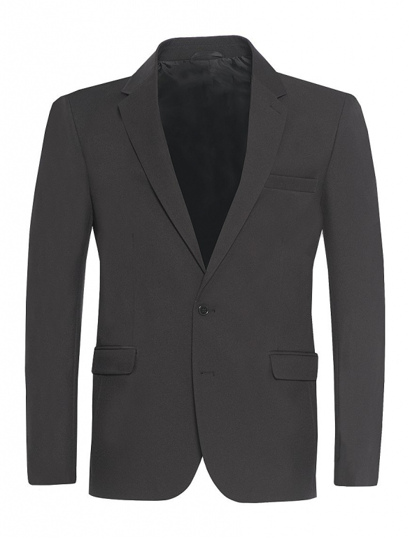 The contemporary slim fit suit jacket is single breasted, made from a polyester fabric construction and treated with a stain resistant finish.