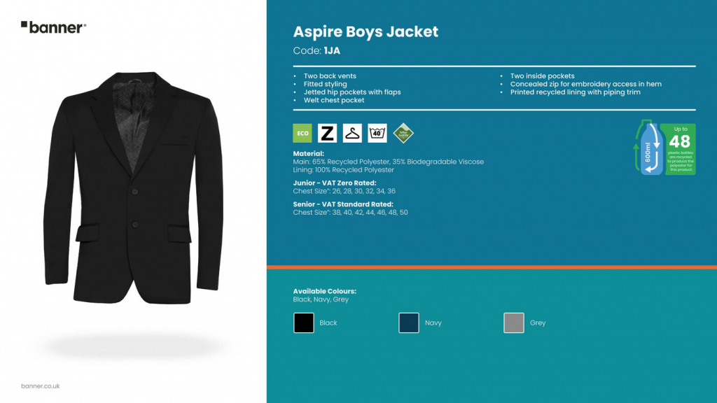 The tailored suit jacket with fitted styling is single breasted, made from a polyester viscose fabric construction and treated with a stain resistant finish.