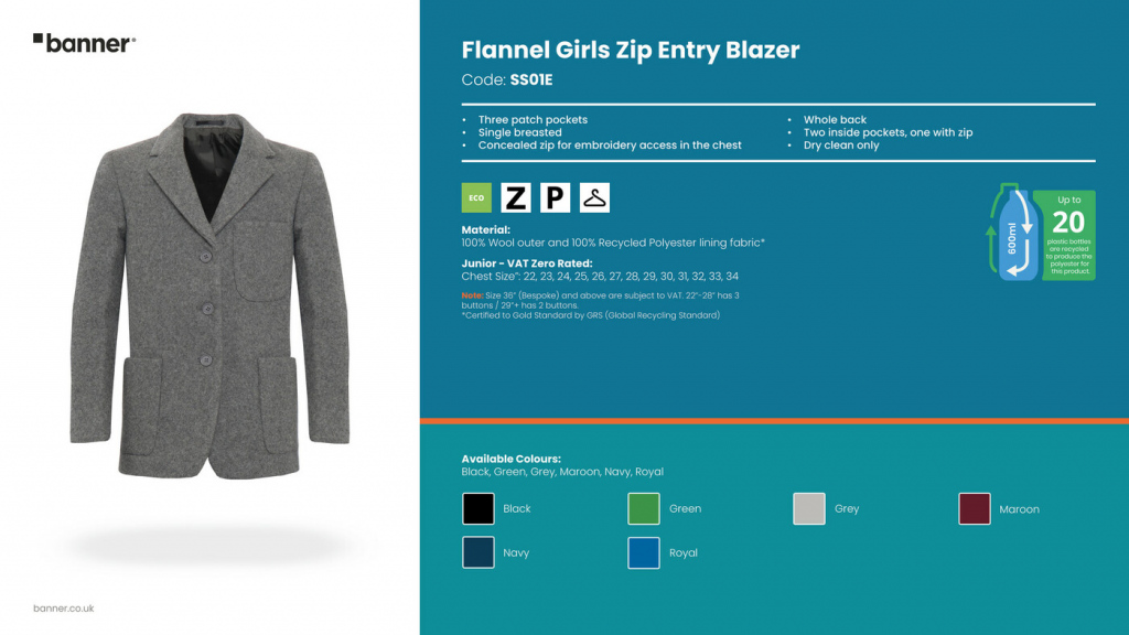 The school uniform flannel blazer for girls is made from 100% wool, its unique properties make it as appropriate for the summer as it is for the winter.  The flannel blazer is a smart addition to any smart, prep or pre-prep school uniform. It is available to purchase blank, or can be embellished with school crest and trim colours, minimums apply.