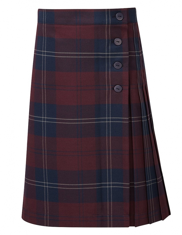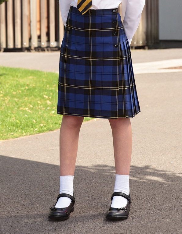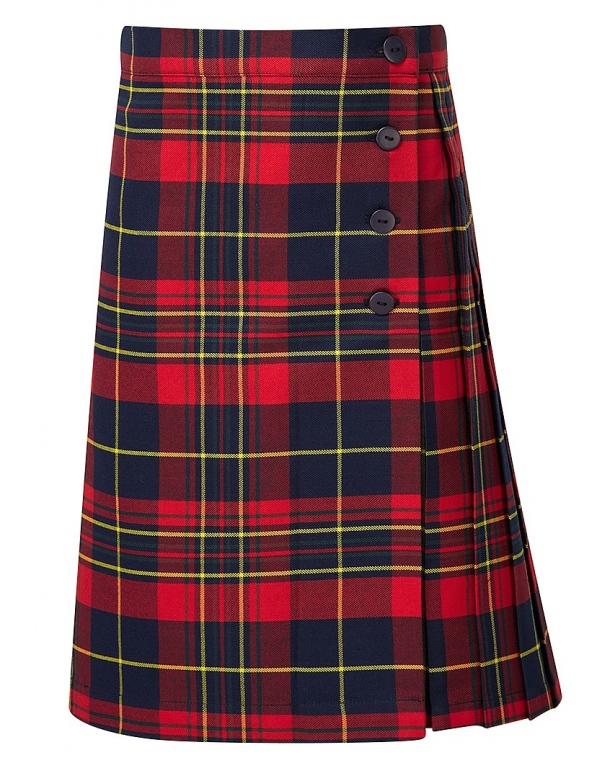 Junior School Tartan Skirt, Kilt Wrap Front with Pleats, Button Waist, Polyester / Viscose