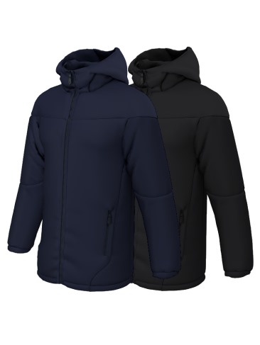 A quality team wear padded coat available in a range of Youth and Adult sizes and two colour ways, navy and black. Water repellant short coat with thermal wadding for extra warmth. Stylishly designed with full zip opening, internal pocket and two deep pockets, hood and internal powerstretch cuffs.