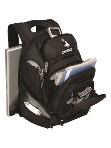Ogio quality branded backpack. The backpack opens wide to take a laptop, files, folders and more. With a huge centre compartment and an abundance of well placed pockets, the laptop backpack has plenty of space for the active student to be prepared for any eventuality.