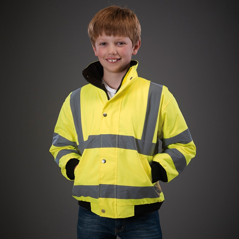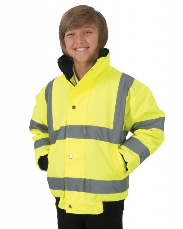 High visibility safety school hi vis bomber jacket in fluorescent yellow with 2 reflective bands across the torso and arms, and one brace over each shoulder.