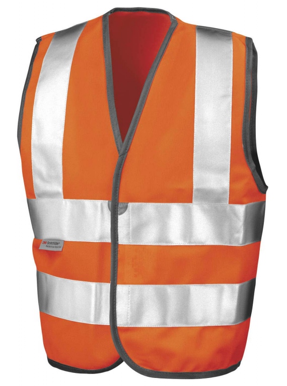 High visibility safety school hi vis waistcoat vest in fluorescent orange and yellow with grey polyester bound edges, 2 reflective bands across the torso and one brace over each shoulder.