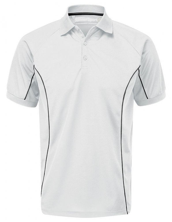 The school games polo shirt has contrasting colour piping along side panel seams. Straight hem style, boys / mens button placket, flat knit collar and ribbed short sleeve cuffs.