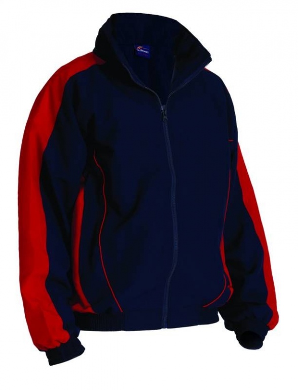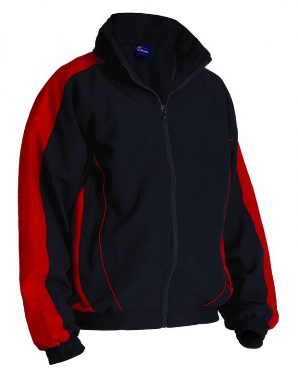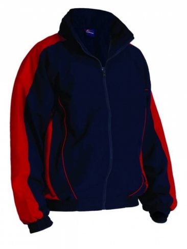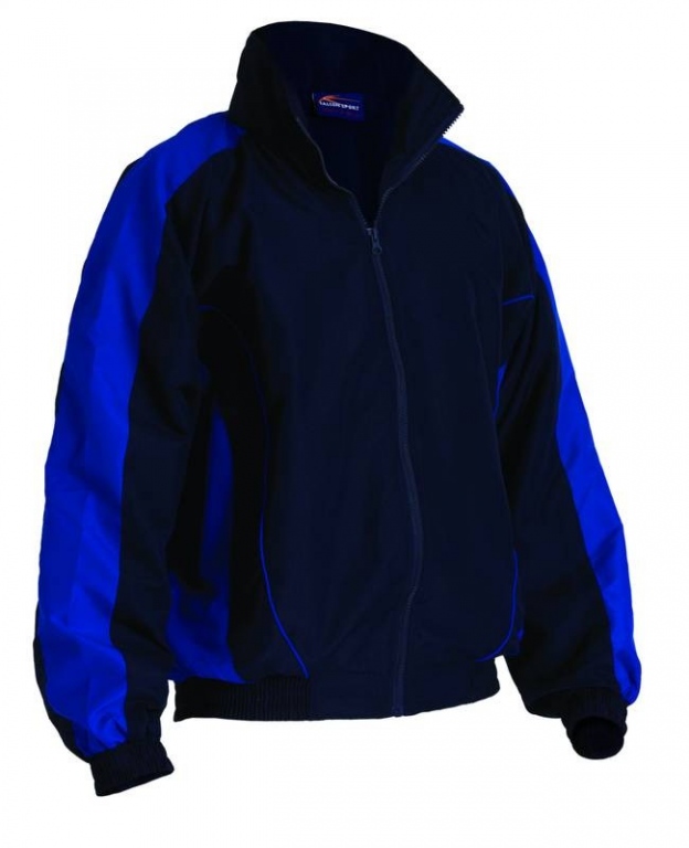 Sports training top jacket with 100% polyester outer and warm poly/cotton lining, turning to nylon at sleeves. Sports design with contrast panels, full zip front fastening, elasticated cuffs and 2 zip pockets.