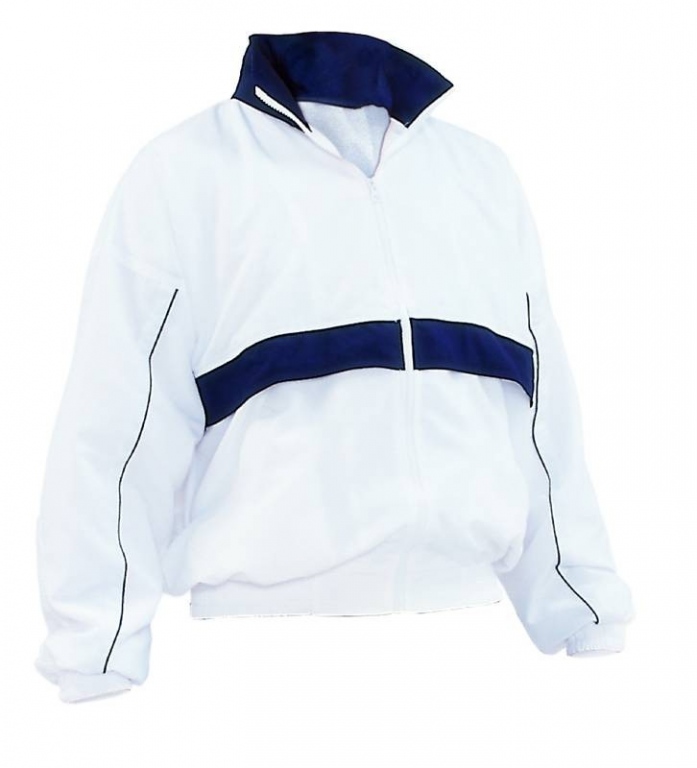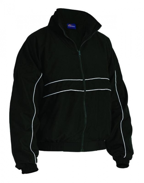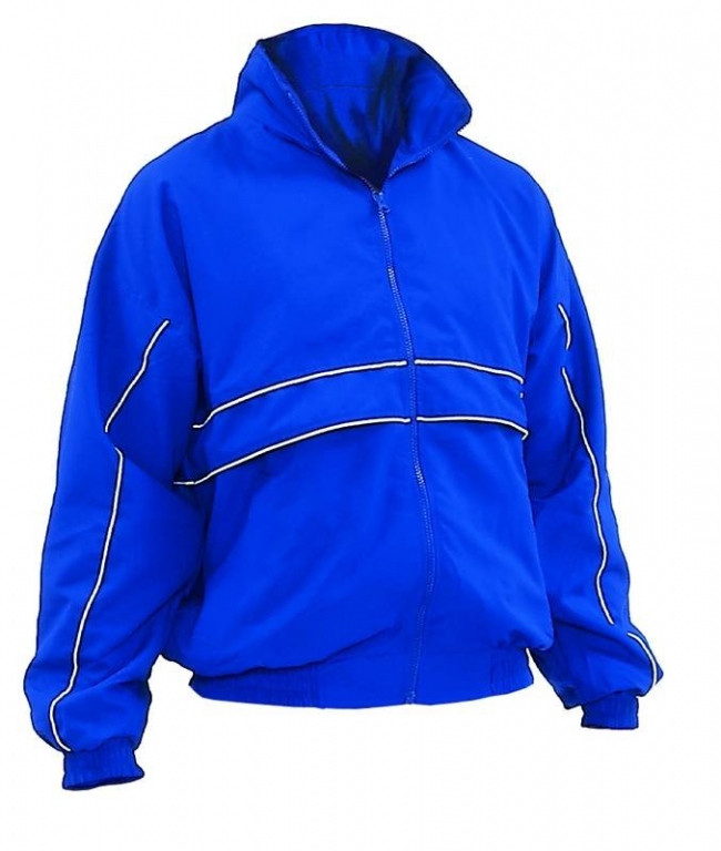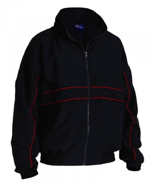 Sports training top jacket with 100% polyester outer and warm poly/cotton lining, turning to nylon at sleeves. Sports design with contrast piping, full zip front fastening, elasticated cuffs and 2 zip pockets.