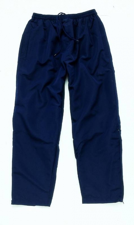 Sports training trouser bottoms with 100% polyester outer and warm poly/cotton lining, turning to nylon at the bottom. Sports design with straight unelasticated bottoms with zips and inserts. 2 side pockets with zips and one hip pocket.