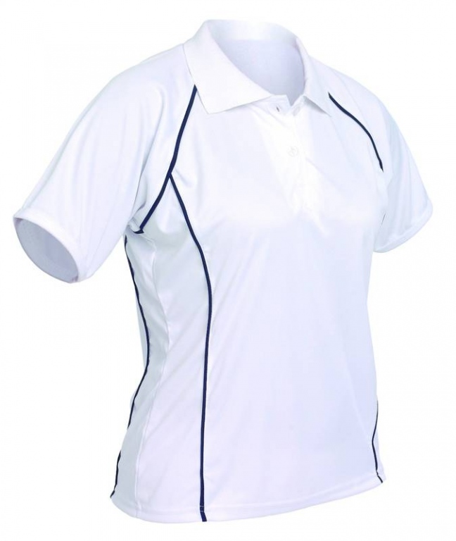 White 100% Active Stretch Polyester Fitted Polo Shirt Short Sleeve Top with contrast navy blue piping.