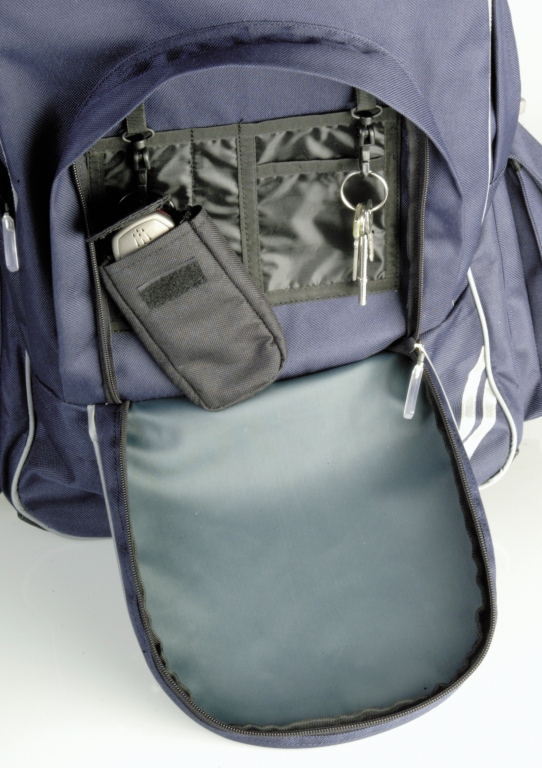 The senior school backpack rucksack is heavy duty quality made of 450D coated polyester. The bag has padded lumbar support and shoulder pads for comfort and Blazer Buddy fabric on straps to help protect student's school uniform. A separate waterproof kit compartment will separate wet sports kit to keep books and papers dry without the need for a second bag. With a zipped front organiser section and 2 side pockets, the rucksack / backpack has plenty of room for all the necessities needed by today's busy student.